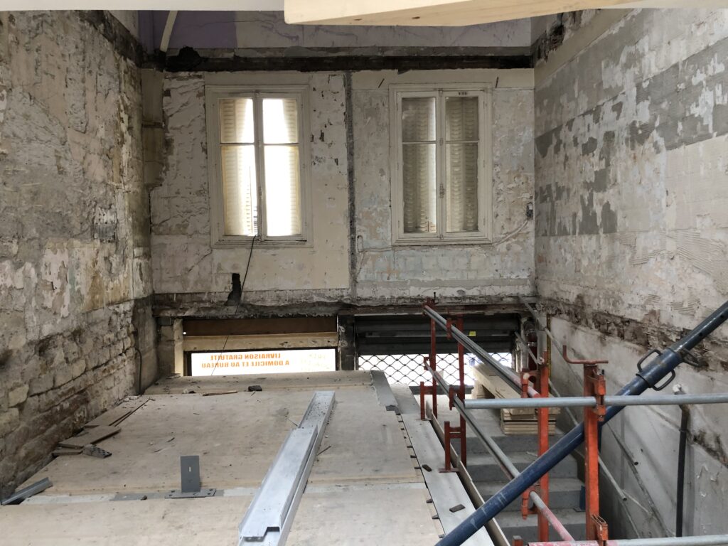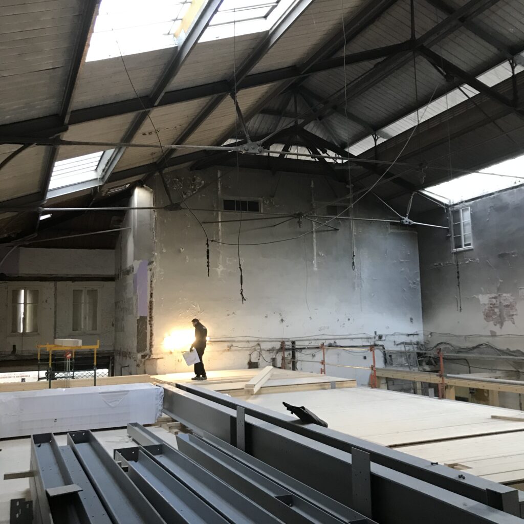 Le chantier met en œuvre un travail précis d’adaptation de l’existant, associant restauration des structures, amélioration des performances techniques et intégration d’éléments architecturaux spécifiques.