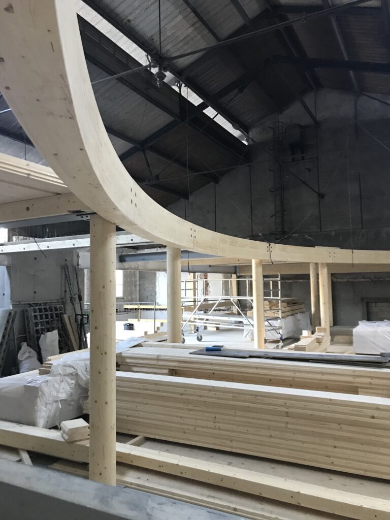 Le chantier s’inscrit également dans une démarche de chantier propre, visant à limiter les nuisances et à optimiser la gestion des déchets et des flux sur site. L’intervention privilégie par ailleurs l’usage du bois, matériau central du projet, qui structure les aménagements intérieurs et contribue à créer une atmosphère chaleureuse et apaisée au sein de l’espace de prière. Ce choix constructif participe à la fois à la qualité architecturale du lieu et à une approche plus durable de la transformation du bâtiment.