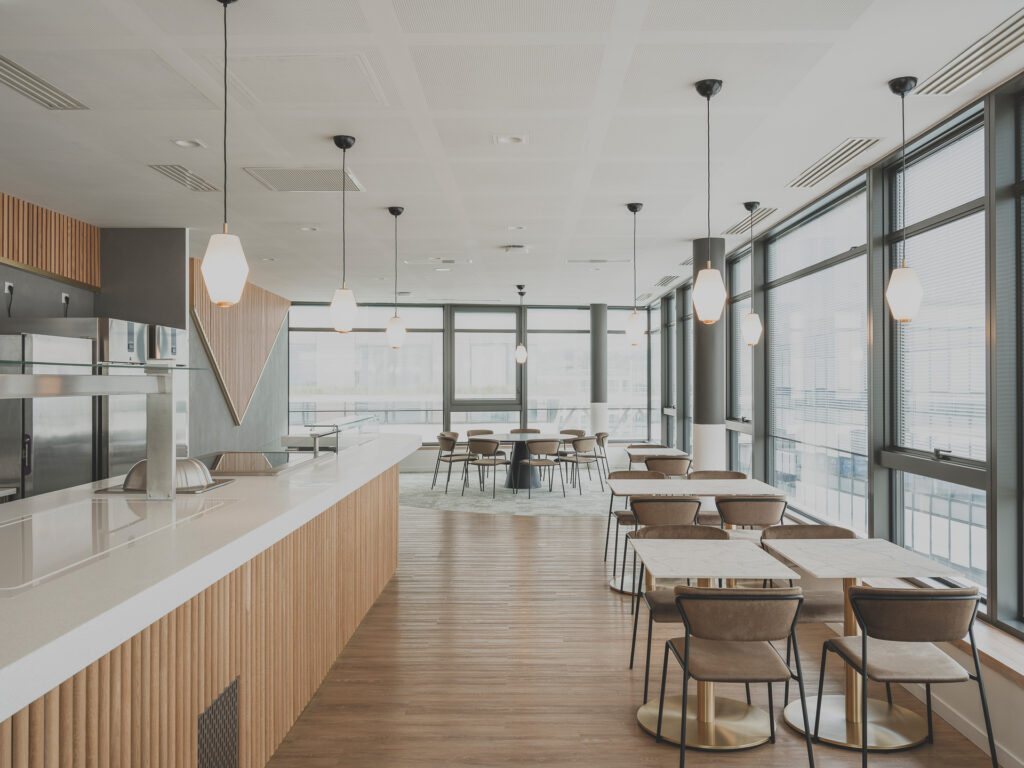 L’aménagement intérieur du nouveau siège de Lidl France accompagne la création d’un campus tertiaire de 39 500 m². Les espaces de travail sont conçus sur de grands plateaux ouverts et lumineux, favorisant la collaboration et la circulation des équipes, tout en permettant une forte flexibilité d’usage grâce à des dispositifs techniques et spatiaux réversibles.