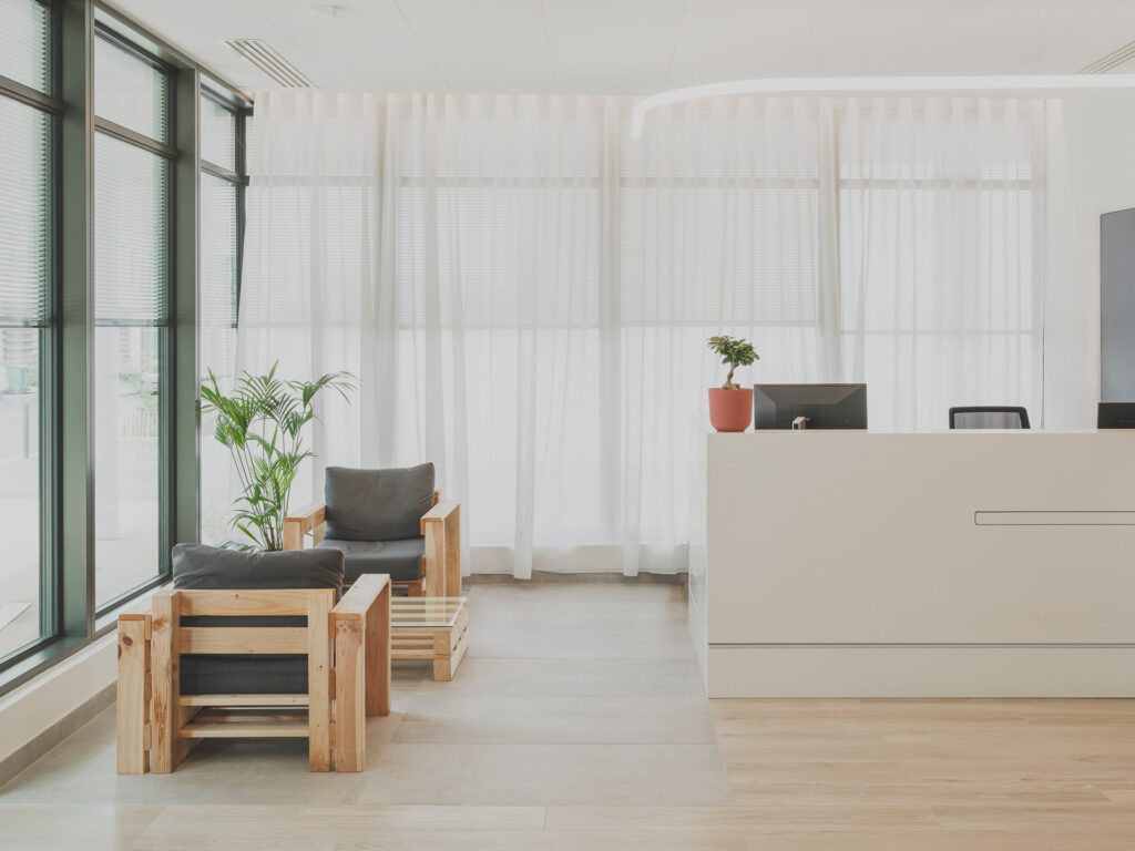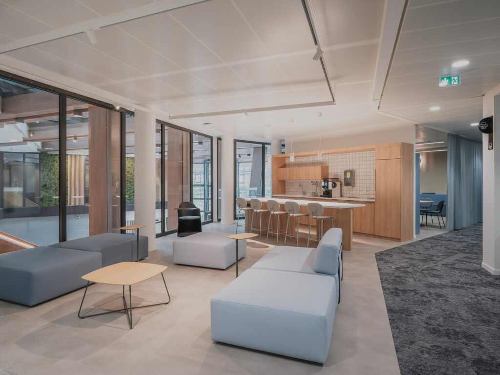 L’architecture intérieure privilégie la lumière naturelle, la transparence et la continuité avec les espaces extérieurs, renforçant le lien entre les plateaux de bureaux et le cœur paysager du campus. Les espaces sont pensés pour accompagner les nouvelles pratiques de travail : échanges informels, travail collectif et appropriation des lieux par les utilisateurs.